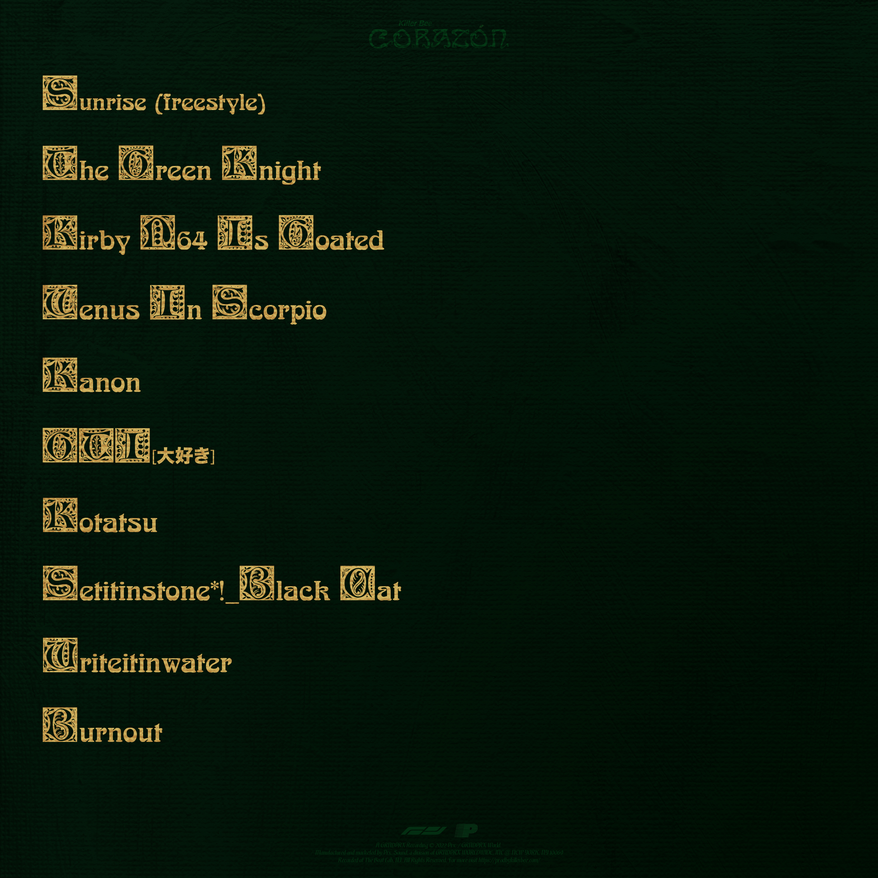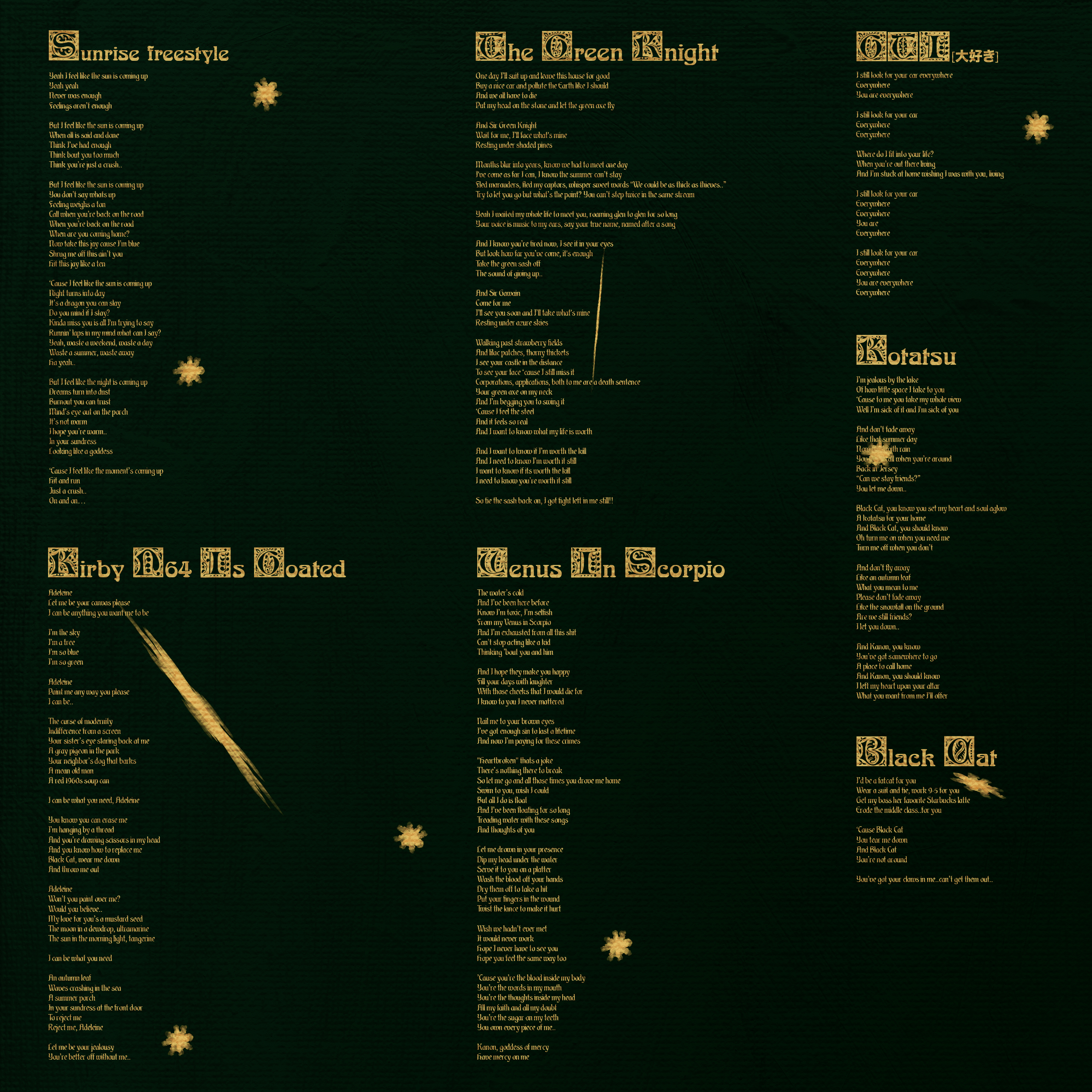 I don't know if each character is supposed to represent a sin (besides Melodias as the sin of wrath which is pretty obvious lmao) but someone probably smarter than me might be able to dissect it and tie them all together. The final and most prominent sword (Saber's Excalibur) is supposed to represent the sin/virtue of desire/love with the person this album is about's hand plunging it into my heart. I like examining the non duality/dichotomy and the two sides of the coin of love and devotion. The idea that love can bring you the greatest pleasure or the greatest pain. The sword of love can often cut the deepest. The text elements and font throughout the booklet are meant to represent elements from the Art Nouveau art scene, as well as a play on a children's fairytale storybook. There is a bookcase in the studio where I make music which holds an old children's fairytale book that my parents used to read to me when I was younger and when I was stuck on lyrics I would flip through the book for inspiration. "The Green Knight" was one of these tales which subsequently inspired me to write that song, as well as many of the design elements in the booklet. So I wanted this album to sound like a fairytale, a beginning and an end to a daydream. And of course, a bunch of other things inspired it: Anime like Bakemonogatari, Horimiya, Fruits Basket, Berserk, and My Dress Up Darling. TV Shows like Star Wars Rebels, Stranger Things, Chernobyl, Venture Bros, and Aqua Teen Hunger Force. Movies like 'Drive My Car', 'Eyes Wide Shut', and 'The Batman'. Painters like David Hockney, John Valadez, and Hiroshi Nagai. Albums like 'House of Sugar' by Alex G, 'Dragon New Warm Mountain I Believe In You' by Big Thief, 'Weatherglow' by Asian Glow & Weatherady, 'Let It Be', 'Sgt. Pepper's Lonely Hearts Club Band' and the 'White Album' by The Beatles, and 'Pet Sounds' by The Beach Boys. Authors like Ntozake Shange and Michel Foucault. Teachers like Ram Dass, Michael Parenti, Jiddu Krishnamurti, and Alan Watts. Genres like indie folk, indie rock, emo, shoegaze, dream pop, dreamgaze, bedroom pop, indietronica, electronic, UKG, jungle, skate punk, R&B, chamber pop, and more. Religions like Christianity, Hinduism, and Zen Buddhism. Artists like Alex G, Phoebe Bridgers, The Beatles, The Beach Boys, Frank Ocean, Soccer Mommy, Teen Daze, Tigers Jaw, Jyocho, Teezo Touchdown, Clairo, Kendrick Lamar, Doss, SOPHIE, umru, Kacey Musgraves, Knxwledge, J Dilla, Flying Lotus, DOMi & JD BECK, Keeth, Owen, Black Country New Road, Jane Remover, Glaive, kmoe, Tricot, my hair is bad, Hitomi Tohyama, Happy End, Asap Rocky, Takashi Kokubo, and so so much more across all of these inspirations that I will get more into later.