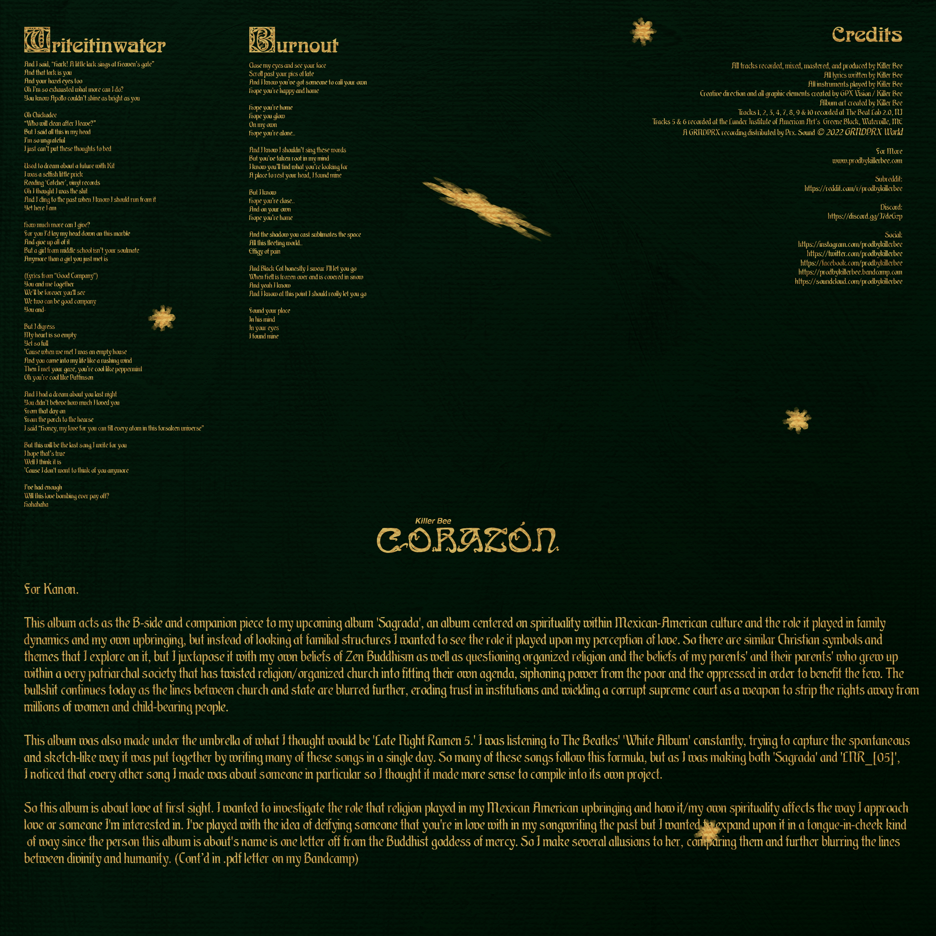 This album acts as the B-side and companion piece to my upcoming album 'Sagrada', an album centered on spirituality within Mexican-American culture and the role it played in family dynamics and my own upbringing, but instead of looking at familial structures I wanted to see the role it played upon my perception of love. So there are similar Christian symbols and themes that I explore on it, but I juxtapose it with my own beliefs of Zen Buddhism as well as questioning organized religion and the beliefs of my parents' and their parents' who grew up within a very patriarchal society that has twisted religion/organized church into fitting their own agenda, siphoning power from the poor and the oppressed in order to benefit the few. The bullshit continues today as the lines between church and state are blurred further, eroding trust in institutions and wielding a corrupt supreme court as a weapon to strip the rights away from millions of women and child-bearing people.