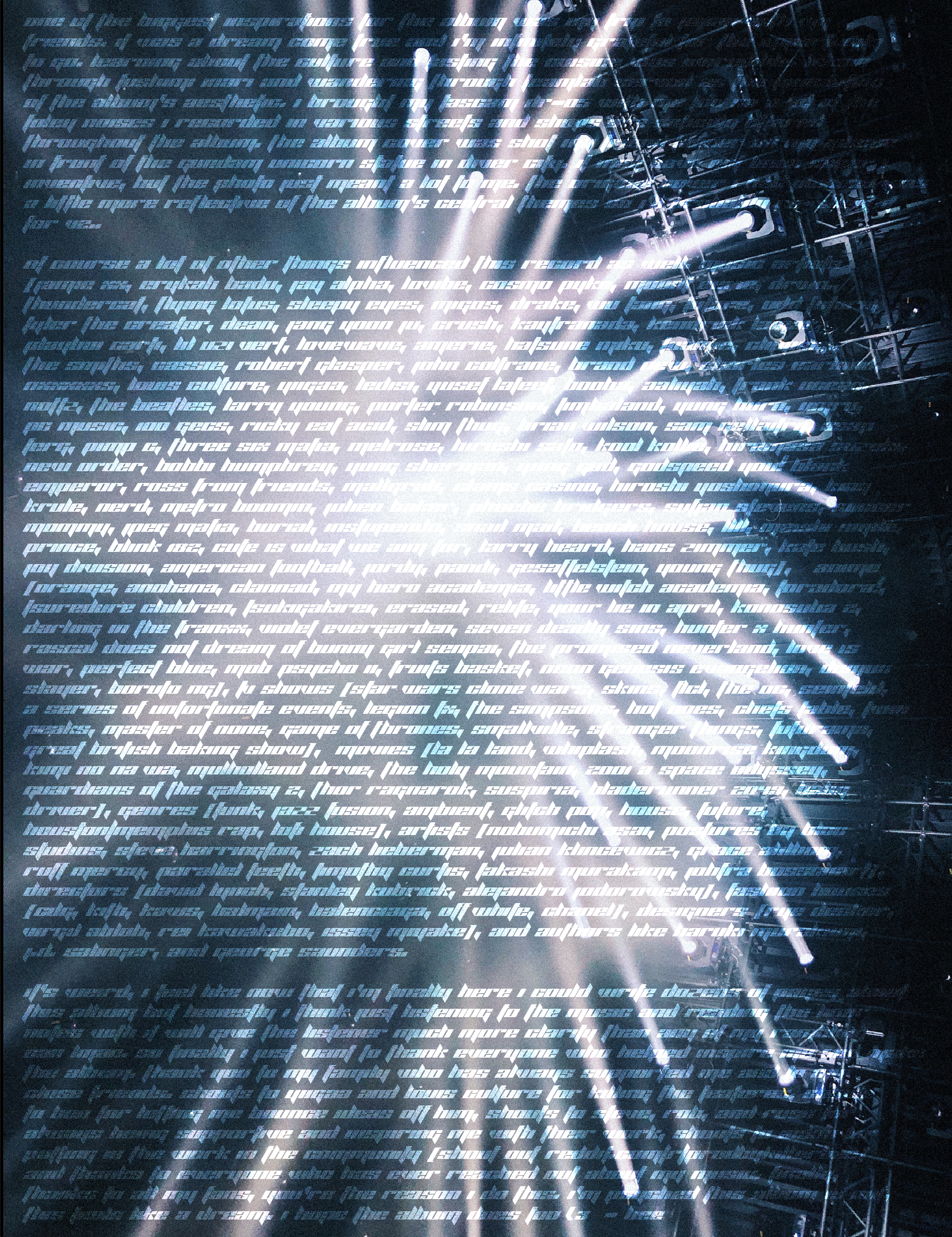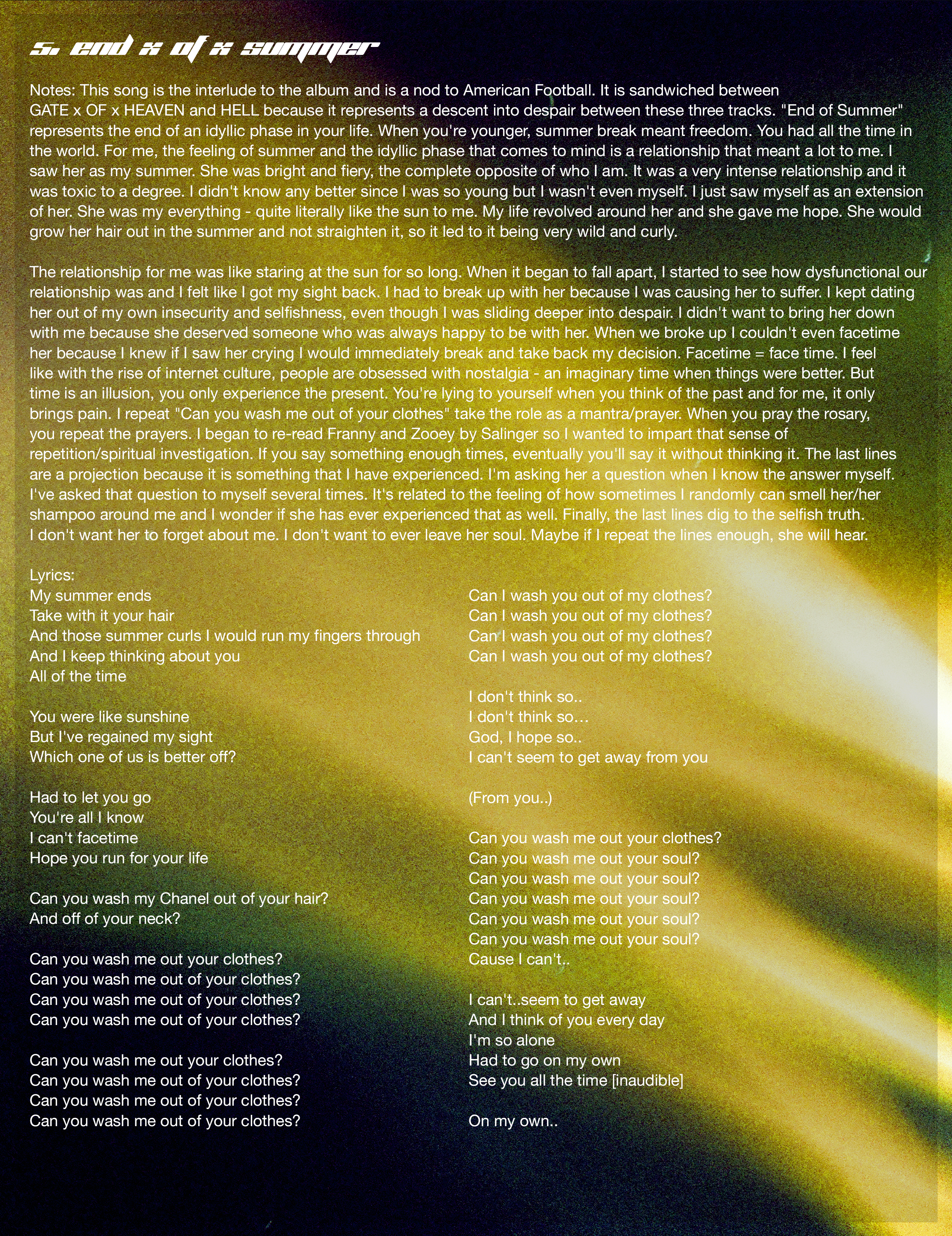 Notes: This song is the interlude to the album and is a nod to American Football. It is sandwiched between GATE x OF x HEAVEN and HELL because it represents a descent into despair between these three tracks. "End of Summer" represents the end of an idyllic phase in your life. When you're younger, summer break meant freedom. You had all the time in the world. For me, the feeling of summer and the idyllic phase that comes to mind is a relationship that meant a lot to me. I saw her as my summer. She was bright and fiery, the complete opposite of who I am. It was a very intense relationship and it was toxic to a degree. I didn't know any better since I was so young but I wasn't even myself. I just saw myself as an extension of her. She was my everything - quite literally like the sun to me. My life revolved around her and she gave me hope. She would grow her hair out in the summer and not straighten it, so it led to it being very wild and curly.