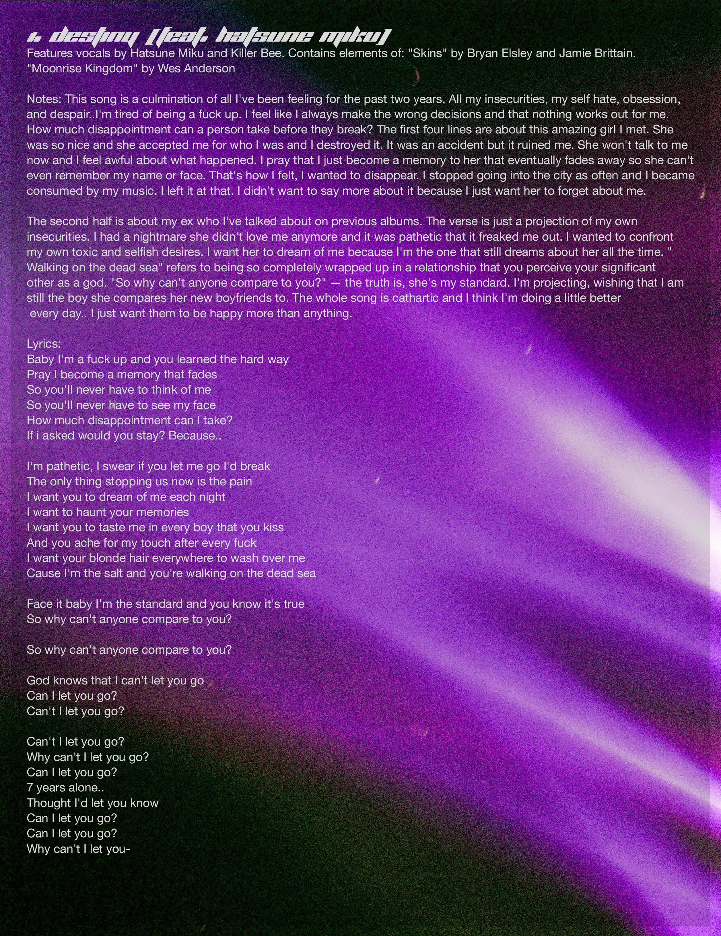 I included these lines because I didn't want the listener to be complacent just because its a sugary pop punk instrumental. I wanted it to act as a kind of sonic keisaku (a wooden stick they smack zen monks with in an effort to wake them up) and challenge my fans to pay attention to the world around them. The chorus centers around the idea of how purity is fleeting - things like your youth, idyllic old relationships, being carefree and spending the summer with your friends, etc. the good old times fly by you without warning. I wanted to present the darker side of reliving old memories and how stuck I felt in them, incapable of change even though everything and everyone around me is changing. The second verse revolves around drug abuse and seeking acceptance from people/society. Specifically, it references Greek hazing and proving that you're worth something to them no matter what the cost (e.g. even if you are in a cast from a broken arm and are on pain medication/shouldn't be drinking). I understand it I guess, I want to be accepted for my music as foolishly as a pledge because I struggle with my own self acceptance. But happiness can only come from within. The second chorus features a line from a Robert Frost poem and last stanza and outro is a nod to Freddie Mercury and his words on "Bohemian Rhapsody". It just captures how I've felt lately. All my energy is spent on creating and I'm so laser focused on the music that I don't take anything else seriously. I feel like nothing matters to me now except for the music.. which is exactly the problem.