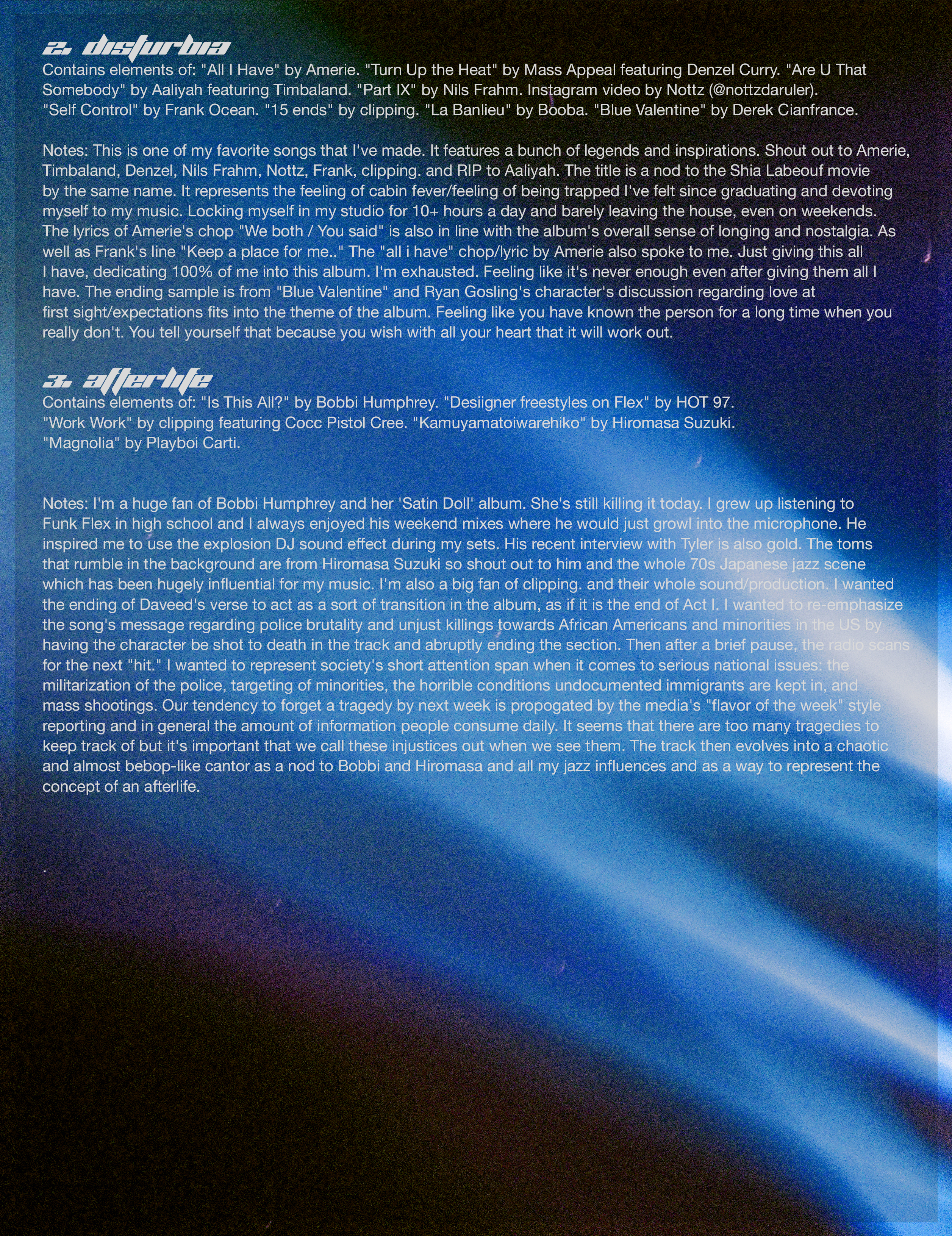 Contains elements of: "All I Have" by Amerie. "Turn Up the Heat" by Mass Appeal featuring Denzel Curry. "Are U That Somebody" by Aaliyah featuring Timbaland. "Part IX" by Nils Frahm. Instagram video by Nottz (@nottzdaruler).  "Self Control" by Frank Ocean. "15 ends" by clipping. "La Banlieu" by Booba. "Blue Valentine" by Derek Cianfrance.