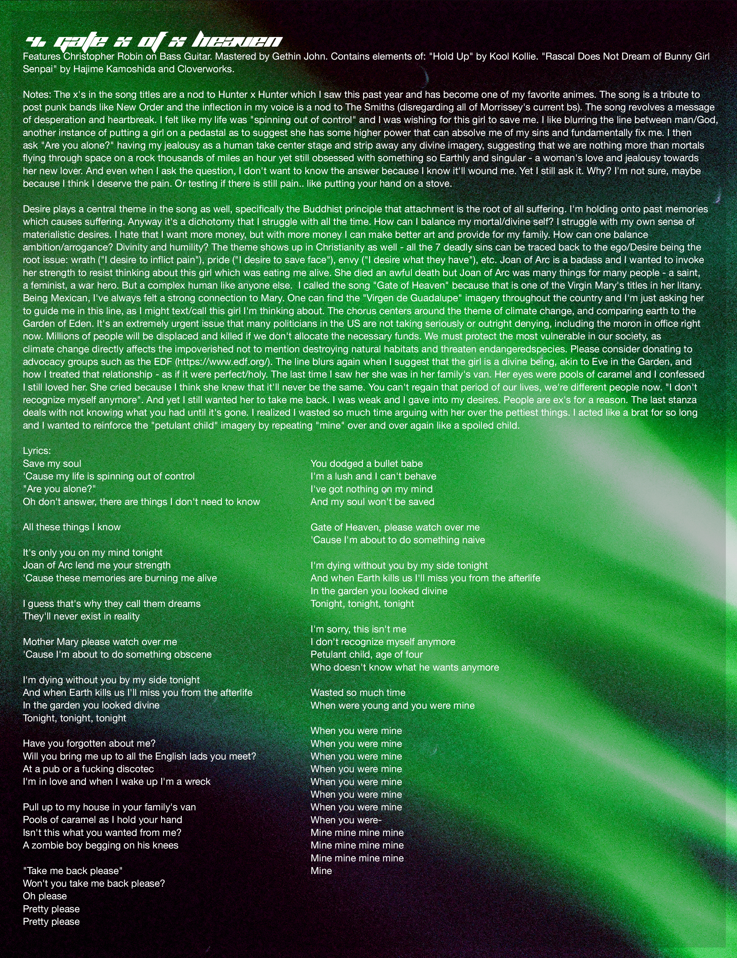 Desire plays a central theme in the song as well, specifically the Buddhist principle that attachment is the root of all suffering. I'm holding onto past memories which causes suffering. Anyway it's a dichotomy that I struggle with all the time. How can I balance my mortal/divine self? I struggle with my own sense of materialistic desires. I hate that I want more money, but with more money I can make better art and provide for my family. How can one balance ambition/arrogance? Divinity and humility? The theme shows up in Christianity as well - all the 7 deadily sins can be traced back to the ego/Desire being the root issue: wrath ("I desire to inflict pain"), pride ("I desire to save face"), envy ("I desire what they have"), etc. Joan of Arc is a badass and I wanted to invoke her strength to resist thinking about this girl which was eating me alive. She died an awful death but Joan of Arc was many things for many people - a saint, a feminist, a war hero. But a complex human like anyone else.  I called the song "Gate of Heaven" because that is one of the Virgin Mary's titles in her litany. Being Mexican, I've always felt a strong connection to Mary. One can find the "Virgen de Guadalupe" imagery throughout the country and I'm just asking her to guide me in this line, as I might text/call this girl I'm thinking about. The chorus centers around the theme of climate change, and comparing earth to the Garden of Eden.