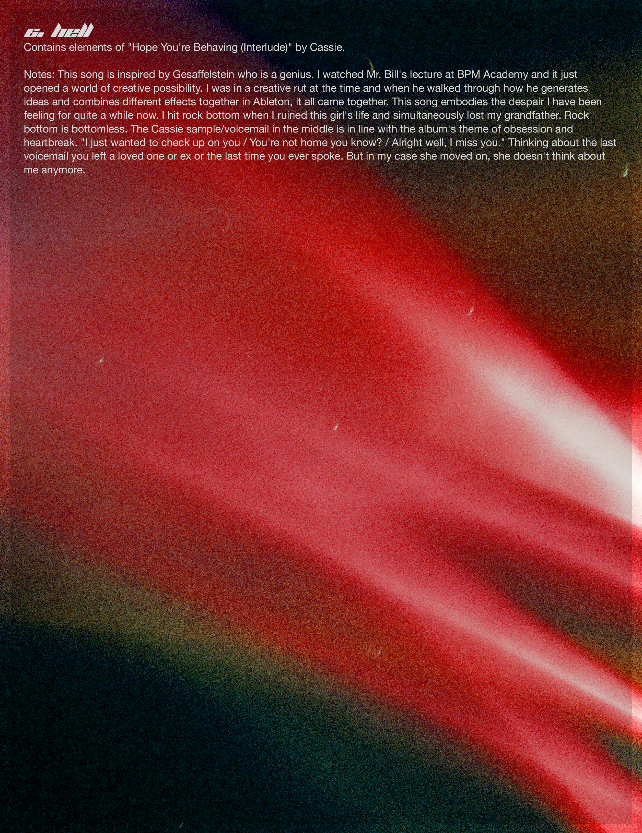 Notes: This song is inspired by Gesaffelstein who is a genius. I watched Mr. Bill's lecture at BPM Academy and it just opened a world of creative possibility. I was in a creative rut at the time and when he walked through how he generates ideas and combines different effects together in Ableton, it all came together. This song embodies the despair I have been feeling for quite a while now. I hit rock bottom when I ruined this girl's life and simultaneously lost my grandfather. Rock bottom is bottomless. The Cassie sample/voicemail in the middle is in line with the album's theme of obsession and heartbreak. "I just wanted to check up on you / You're not home you know? / Alright well, I miss you." Thinking about the last voicemail you left a loved one or ex or the last time you ever spoke. But in my case she moved on, she doesn't think about me anymore.