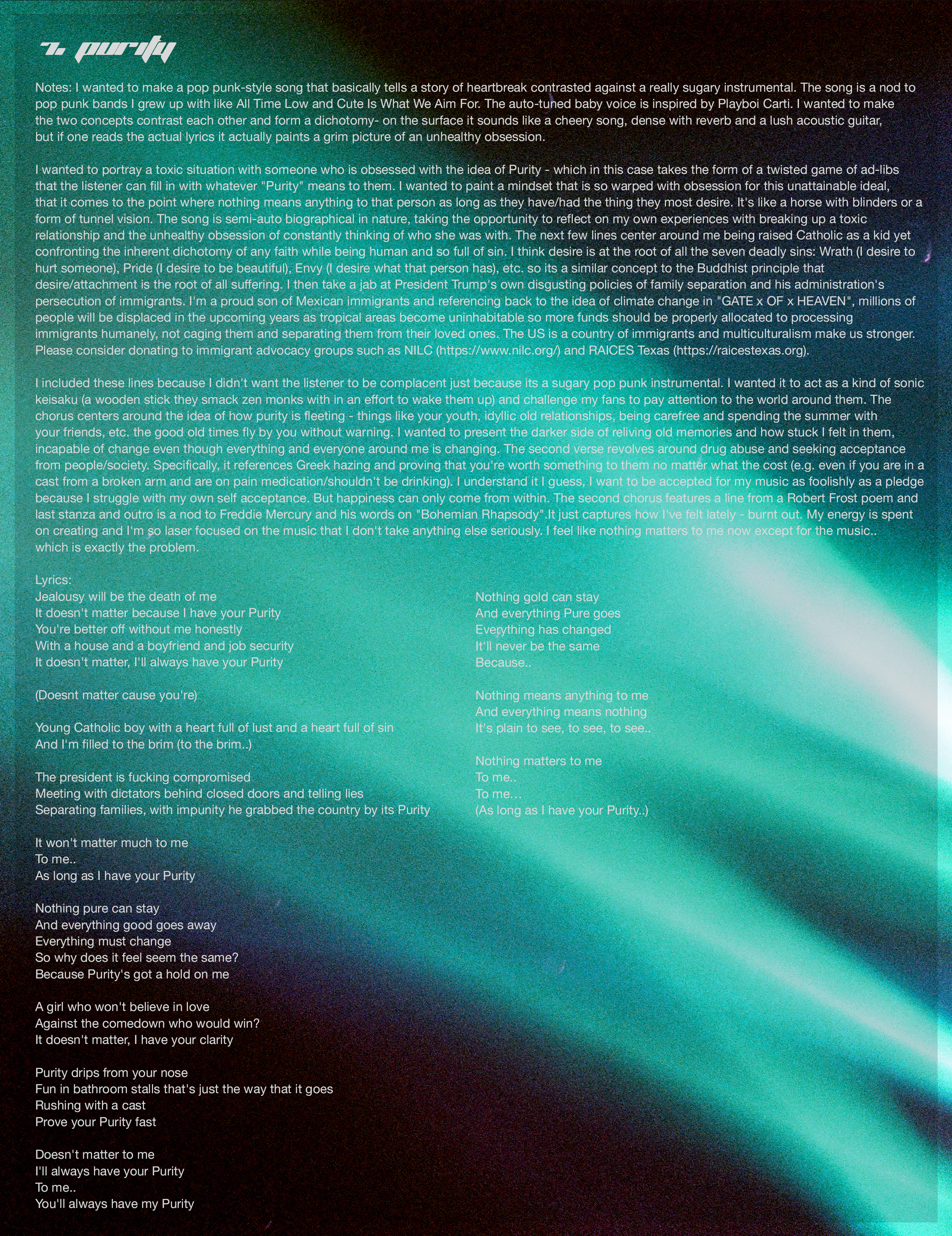 I wanted to portray a toxic situation with someone who is obsessed with the idea of Purity - which in this case takes the form of a twisted game of ad-libs that the listener can fill in with whatever "Purity" means to them. I wanted to paint a mindset that is so warped with obsession for this unattainable ideal, that it comes to the point where nothing means anything to that person as long as they have/had the thing they most desire. It's like a horse with blinders or a form of tunnel vision. The song is semi-auto biographical in nature, taking the opportunity to reflect on my own experiences with breaking up a toxic relationship and the unhealthy obsession of constantly thinking of who she was with. The next few lines center around me being raised Catholic as a kid yet confronting the inherent dichotomy of any faith while being human and so full of sin. I think desire is at the root of all the seven deadly sins: Wrath (I desire to hurt someone), Pride (I desire to be beautiful), Envy (I desire what that person has), etc. so its a similar concept to the Buddhist principle that desire/attachment is the root of all suffering. I then take a jab at President Trump's own disgusting policies of family separation and his administration's persecution of immigrants. I'm a proud son of Mexican immigrants and referencing back to the idea of climate change in "GATE x OF x HEAVEN", millions of people will be displaced in the upcoming years as tropical areas become uninhabitable so more funds should be properly allocated to processing immigrants humanely, not caging them and separating them from their loved ones. The US is a country of immigrants and multiculturalism make us stronger. Please consider donating to immigrant advocacy groups such as NILC (https://www.nilc.org/) and RAICES Texas (https://raicestexas.org).