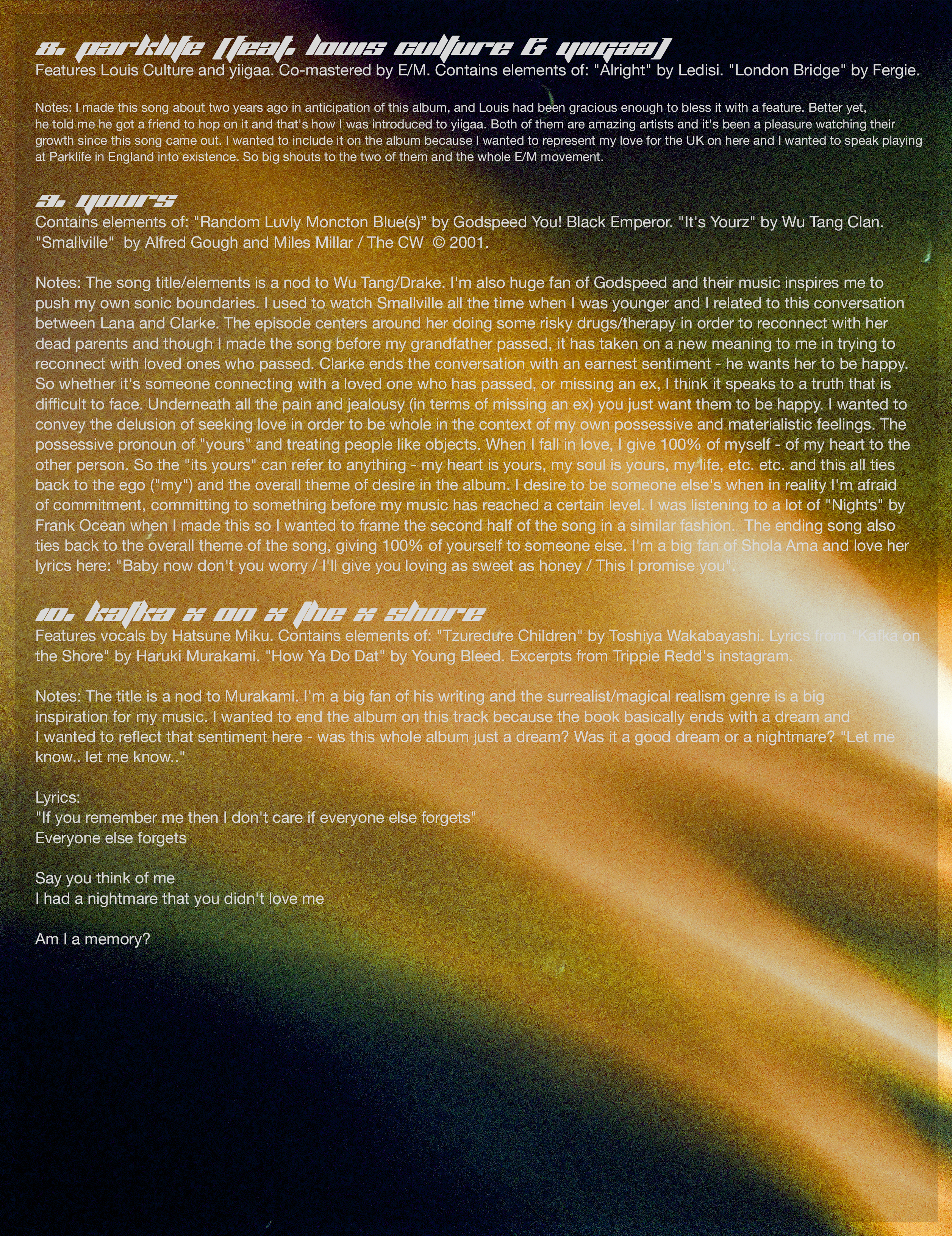 Notes: I made this song about two years ago in anticipation of this album, and Louis had been gracious enough to bless it with a feature. Better yet, he told me he got a friend to hop on it and that's how I was introduced to yiigaa. Both of them are amazing artists and it's been a pleasure watching their growth since this song came out. I wanted to include it on the album because I wanted to represent my love for the UK on here and I wanted to speak playing at Parklife in England into existence. So big shouts to the two of them and the whole E/M movement.